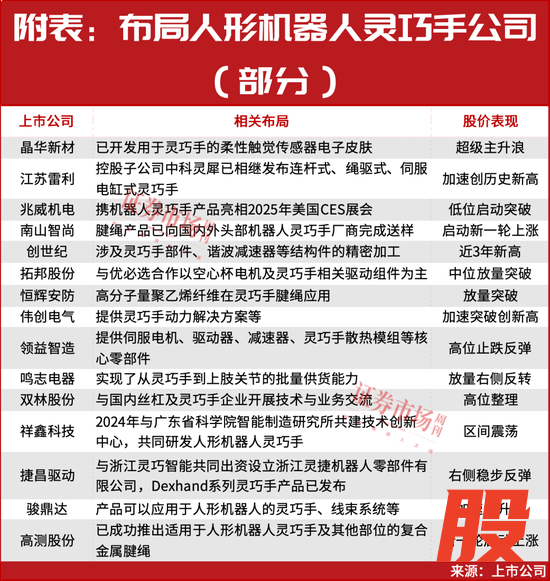 在今天的内容里,笔者重点跟大家梳理一下在灵巧手有业务布局的相关公司。最近,灵巧手这一细分领域有多方面的利好刺激,且不少强势股也都是出自该领域,如晶华新材,公司股价近期稳步强劲上涨,开启超级主升浪。另外,还有其他多家公司股价表现强势,具体名单大家可见(附表)。