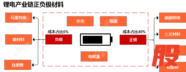 从锂电池整体的产业链来看,锂电池产业链上游大致可分为正极材料、负极材料、隔膜、电解液四个主要部分。负极材料主要为天然石墨、焦碳和碳纤维等,目前比较先进的负极层状石墨颗粒已采用纳米碳,负极成本占比约为6%。