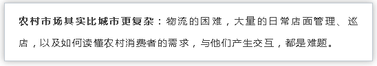 但这种传统方式,在农村就完全不可行。因为,一个村庄到另外一个村庄相隔很远,传统模式下一个人一天只能巡一家店,效率会大幅降低。
